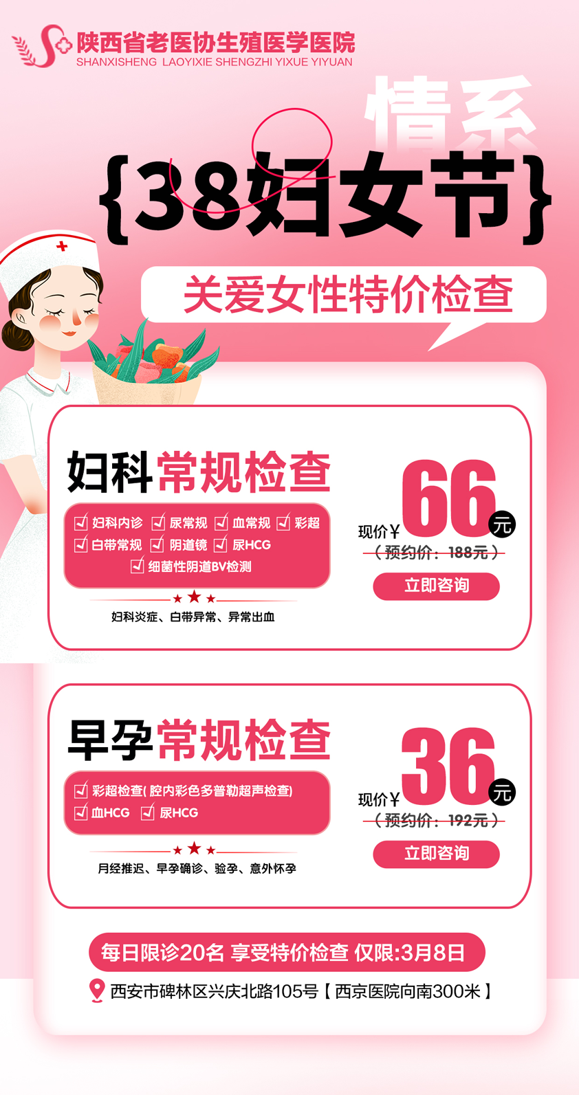 三月的春风,吹开了龙年的新绿,燕语呢喃声里,春色延绵万里。人间三月为自己浪费一点时间,去寻一场关于健康的花色,为自己开启整年的浪漫之旅。在即将到来的“三八”国际妇女节,陕西省老医协生殖医学医院特推出“关爱女性健康”健康体检套餐优惠活动。
